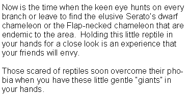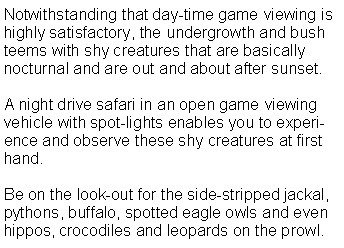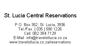 The Eastern Shores consists of a land strip between the lake and the Indian Ocean. Topographical features vary from sandy beach, vegetated high dunes, coastal forest, grassy plain, flood marshes and indigenous forest to lake-side swamp with Mangrove forests. The canopy of the coastal forest is the playground for Samango--and Vervet monkeys, whilst the dense undergrowth is criss-crossed with foot-paths of bush pig, Red Duiker and Bush Buck.